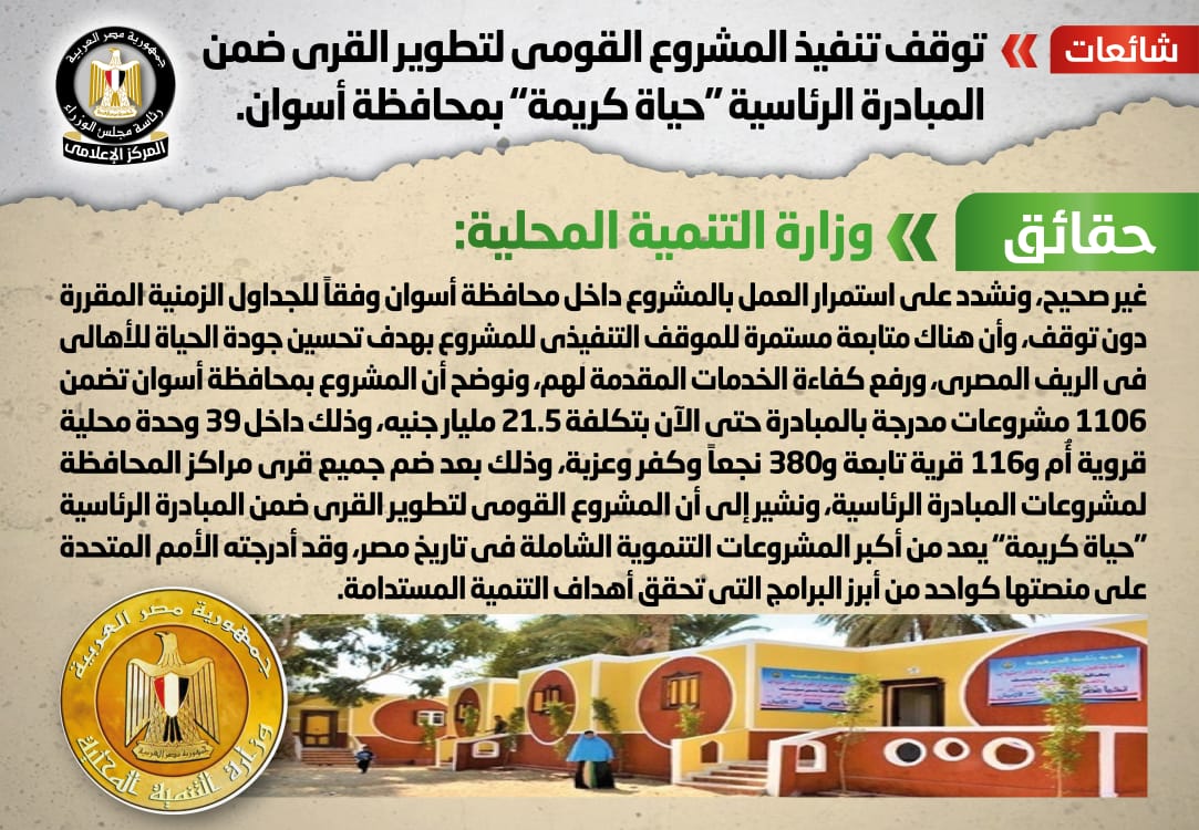 وأكدت الوزارة، أنه لا صحة لتوقف تنفيذ المشروع القومي لتطوير القرى ضمن المبادرة الرئاسية “حياة كريمة” بمحافظة أسوان، مُشددةً على استمرار العمل بالمشروع داخل محافظة أسوان وفقاً للجداول الزمنية المقررة دون توقف، وأن هناك متابعة مستمرة للموقف التنفيذي للمشروع بهدف تحسين جودة الحياة للأهالي في الريف المصري، ورفع كفاءة الخدمات المقدمة لهم، مُوضحةً أن المشروع بمحافظة أسوان تضمن 1106 مشروعات مدرجة بالمبادرة حتى الآن بتكلفة 21.5 مليار جنيه، وذلك داخل 39 وحدة محلية قروية أُم و116 قرية تابعة و380 نجعاً وكفر وعزبة، وذلك بعد ضم جميع قرى مراكز المحافظة لمشروعات المبادرة الرئاسية.