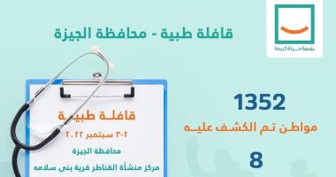 أعلنت مؤسسة حياة كريمة، توقيع الكشف الطبي على 1352 مواطنا، ضمن القافلة الطبية المتواجدة في قرية بنى سلامة التابعة لمركز منشأة القناطر، والتي استمرت على مدار يومي 2 و 3 سبتمبر، وذلك بالتعاون مع وزارة الصحة.