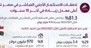 نشر مركز المعلومات ودعم اتخاذ القرار إنفوجرافيك جديدًا يتناول الاستثمار الأجنبي المباشر في مصر؛ حيث ارتفع صافي الاستثمار الأجنبي المباشر في القطاعات غير البترولية خلال 2021/2022 بنحو 81.3% مسجلًا 11.6 مليار دولار.