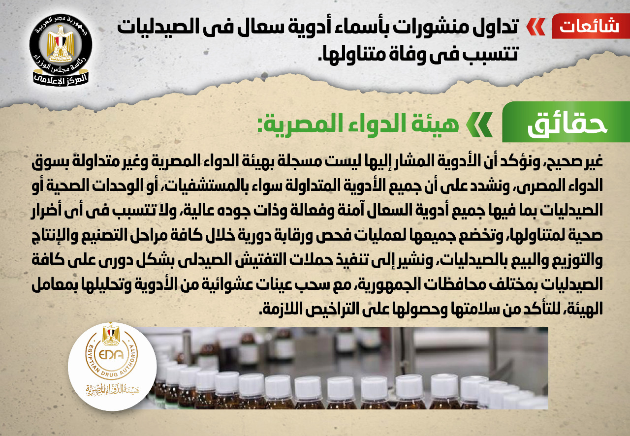 وأكدت الحكومة، أنه لا صحة للمنشورات المتداولة بأسماء أدوية سعال في الصيدليات تتسبب في وفاة متناولها، وأن الأدوية المشار إليها ليست مسجلة بهيئة الدواء المصرية وغير متداولة بسوق الدواء المصري، مُشددةً على أن جميع الأدوية المتداولة سواء بالمستشفيات، أو الوحدات الصحية أو الصيدليات بما فيها جميع أدوية السعال آمنة وفعالة وذات جوده عالية، ولا تتسبب في أي أضرار صحية لمتناولها، وتخضع جميعها لعمليات فحص ورقابة دورية خلال كافة مراحل التصنيع والإنتاج والتوزيع والبيع بالصيدليات، مشيرةً إلى تنفيذ حملات التفتيش الصيدلي بشكل دوري على كافة الصيدليات بمختلف محافظات الجمهورية، مع سحب عينات عشوائية من الأدوية وتحليلها بمعامل الهيئة، للتأكد من سلامتها، وحصولها على التراخيص اللازمة.