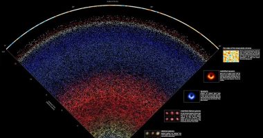 وتعد مجرتنا درب التبانة هي مجرد نقطة صغيرة على الخريطة الشاسعة وهي موضوعة في أسفلها، وفي هذه الأثناء، يُصور الجزء العلوي من الخريطة حافة الكون المرئي، وتتغير الألوان على الخريطة مع التمرير التدريجي لأعلى من درب التبانة.