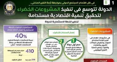 وفي هذا الصدد نشر المركز الإعلامي لمجلس الوزراء تقريراً تضمن إنفوجرافات تسلط الضوء على جهود الدولة للتوسع في تنفيذ المشروعات الخضراء لتحقيق تنمية اقتصادية مستدامة، في ظل اهتمام المجتمع الدولي بمواجهة أزمة التغير المناخي.