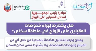 وأكد وزارة الصحة والسكان، حرصها على إمداد المواطنين بالمعلومات، والرد على الاستفسارات الخاصة بمبادرة فحص المقبلين على الزواج من خلال الخط الساخن 15335، أو زيارة الموقع الإلكتروني: www.100millionseha.eg