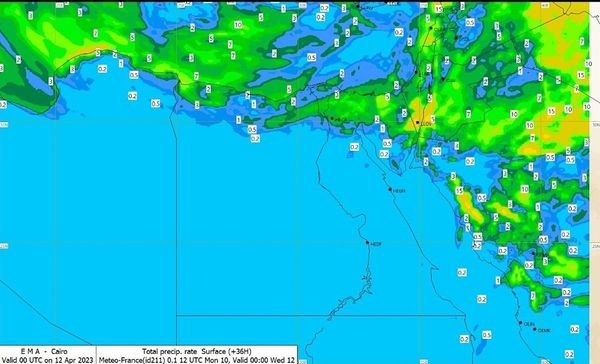 – فرص لسقوط الأمطار تكون متفاوتة الشدة ورعدية أحيانا علي السواحل الشمالية وشمال الوجه البحري تصل خفيفة إلى القاهرة ليلا.
