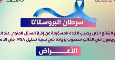 قالت وزارة الصحة والسكان، إن سرطان البروستاتا هو النوع الشائع الذي يصيب الغدة المسؤولة عن إفراز السائل المنوي عند الرجال والسائل المنوى للمصابين بالبروستاتا يكون في الغالب مصحوب بزيادة في نسبة تحليل PSA في الدم .